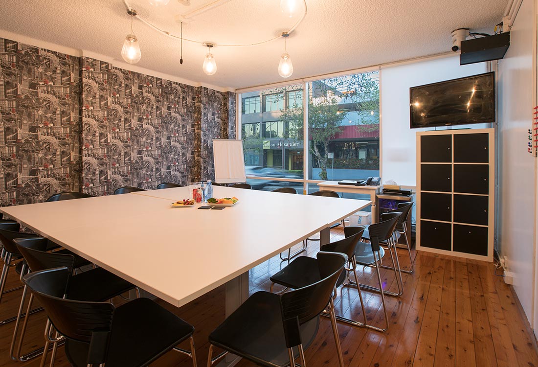 - Facilities: TV with computer inputs, laptop, full-length wall shelving, wifi access, one-way mirror to the viewing room, writable desk, magnetic whiteboard wall, independent air-conditioning