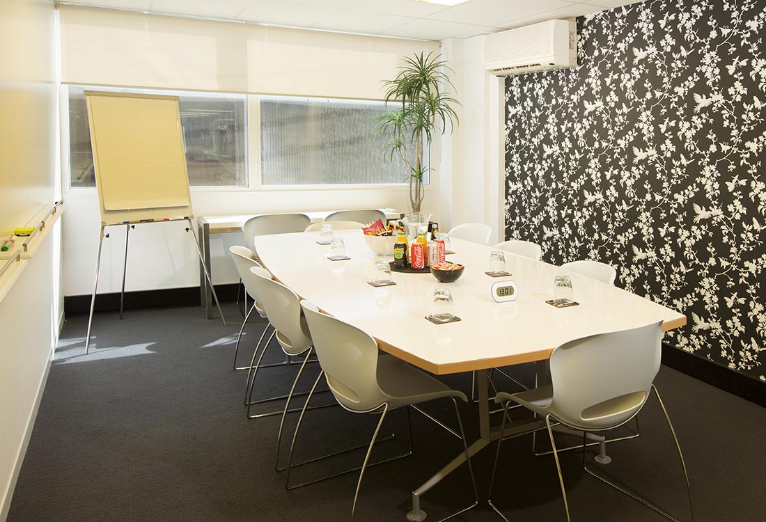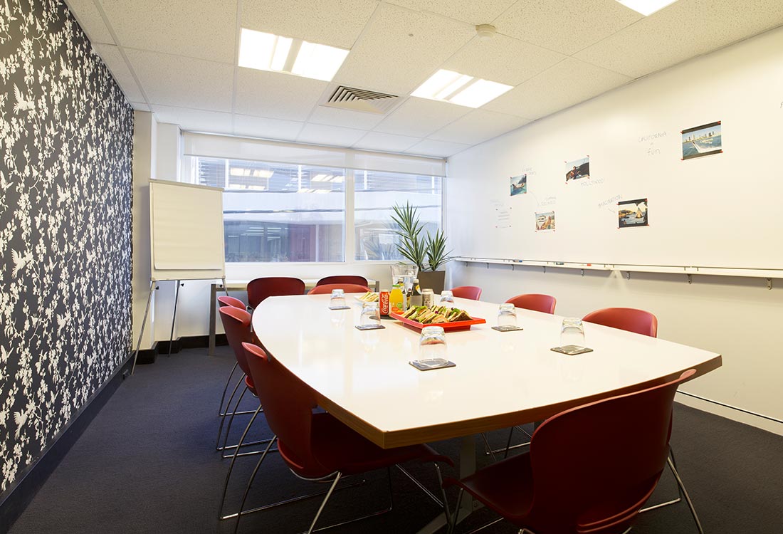 - Facilities: TV with computer inputs, laptop, full-length wall shelving, floor-to-ceiling windows, viewing room via CCTV, and a magnetic whiteboard wall, independent air-conditioning