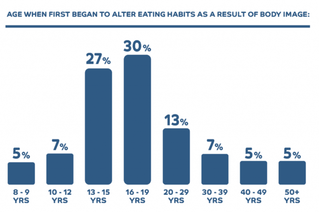 Of the those surveyed through our poll, the most common type of eating disorder respondents suffer or suffered from was Binge Eating Disorder (52%), followed by Anorexia Nervosa (43%). As is commonly the case in the development of eating disorders, the majority of respondents were in their teens, or younger, when they first started to alter the way they ate as a result of body image (70%), and of these, 18% were under the age of 12.