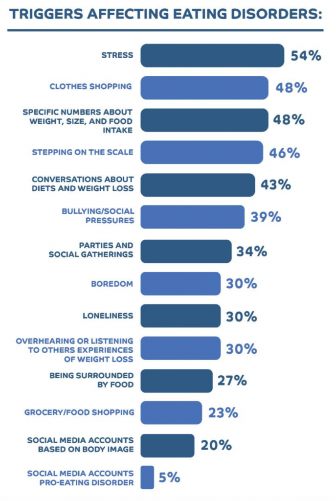 When asked what were the most common triggers which affected their eating disorder, respondents indicted stress as the most significant (54%). The next most common trigger was clothes shopping (48%), followed by specific numbers about weight, size, and food intake (48%), stepping on the scale (46%) and conversations about diets and weight loss (43%). Sufferers face a difficult task in avoiding such type of conversations in Australia’s increasingly popular health and fitness focus, as well as the part that social media plays in increasing the prevalence of these topics.