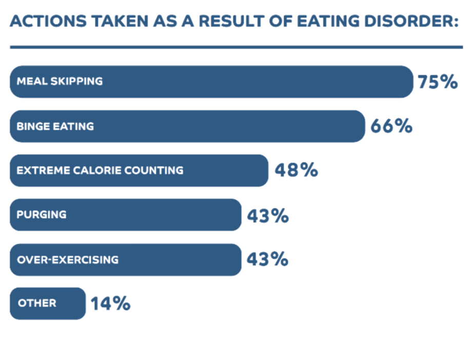 Respondents to the survey listed the types of actions they have taken as a result of their eating disorder, the most common being meal skipping (75%), binge eating (66%), and purging (43%). Purging includes acts that remove food/calories from the body, such as induced vomiting, taking laxatives, or fasting excessively. Often, behaviours can also be hidden under the guise of fitness or health consciousness, with sufferers also reporting used excessive exercise (43%) and extreme calorie counting (48%).