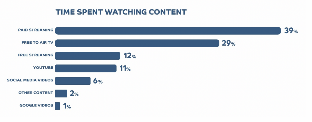 The amount of time we dedicate to watching content in a week is not solely reserved for paid streaming; there is free content available too, such as YouTube, social media, and the good old-fashioned tv channels. However, with all that’s on offer to us, we do spend much of our content time on paid streaming platforms (39%, of the total time we spend watching content). In comparison, about 29% of the time is spent watching free-to-air television, 12% on free streaming services and 11% was spent on YouTube.
