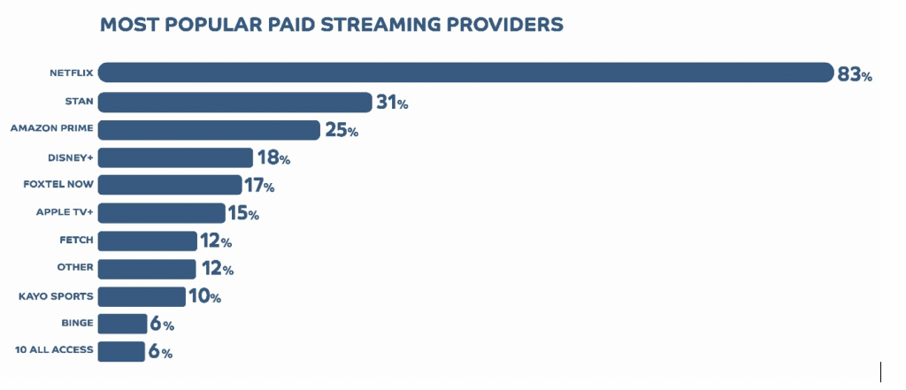 Netflix has ingrained itself into our culture, being the first major disruptor to the long-running co-habitation of free-to-air and cable tv. It is not only the most-used platform (83% of Australians surveyed who have access to paid streaming use Netflix), but it has also achieved the greatest brand awareness (92% of Aussies polled). This is likely due in part to the brand being one of the first major streaming providers launched in Australia; Presto was Foxtel’s first attempt in streaming, launching nearly a year before Netflix, but ceased to operate in 2017.