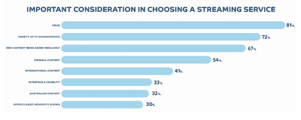 But what else is Netflix doing to have such a hold over the market? Looking at the most important factors that Aussies take into account when choosing a streaming service, price seems to be of greatest concern, an important consideration for 81% of Aussie users. Following this are the variety of content (72%), as well as new content being added regularly (67%). Netflix is in fact the same price or more expensive than other providers, so they seem to be winning by having the superior content and features.