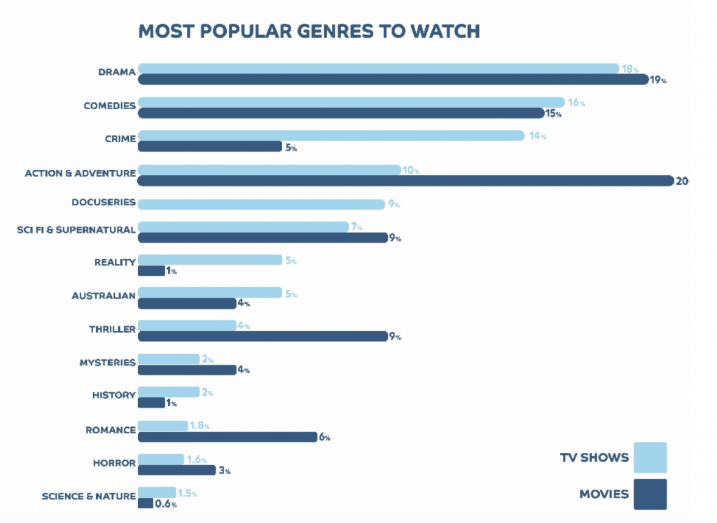 All the features may make the user experience more efficient, but at the end of the day Aussies are here to watch. So, what do we want to watch? The favourite genre reported by respondents for tv shows was Drama (18%), followed by Comedies (16%) and then Crime (14%). But if we feel like watching a film, turns out our favourites differ slightly; the top genre for movies was Action & Adventure (20%), followed by Drama (19%) and then Comedies (15%). From those using more than one platform, Netflix was rated highest as the provider for tv, film, and documentary content, as well as for their top genres, proving once again it is the clear favourite.